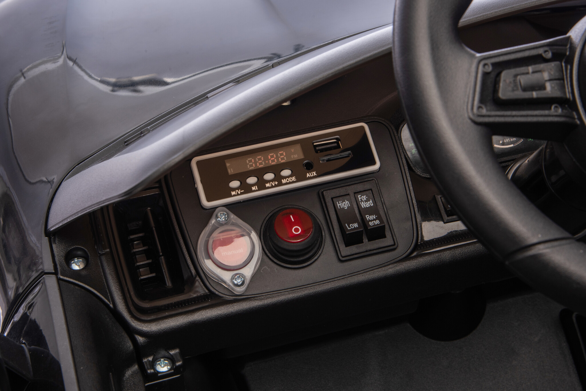 Équipée de deux puissants moteurs 12 volts, la voiture peut rouler sur l'herbe ou les surfaces non pavées. Elle possède également deux vraies portes, des phares et la possibilité d'écouter sa propre musique. Grâce à son démarrage progressif, les enfants bénéficient d'une conduite tout en douceur.
